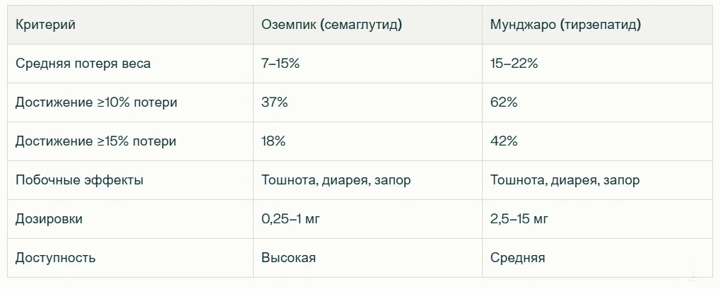 - Оземпик также эффективен, но уступает по результатам Мунджаро, особенно при выраженном ожирении.
